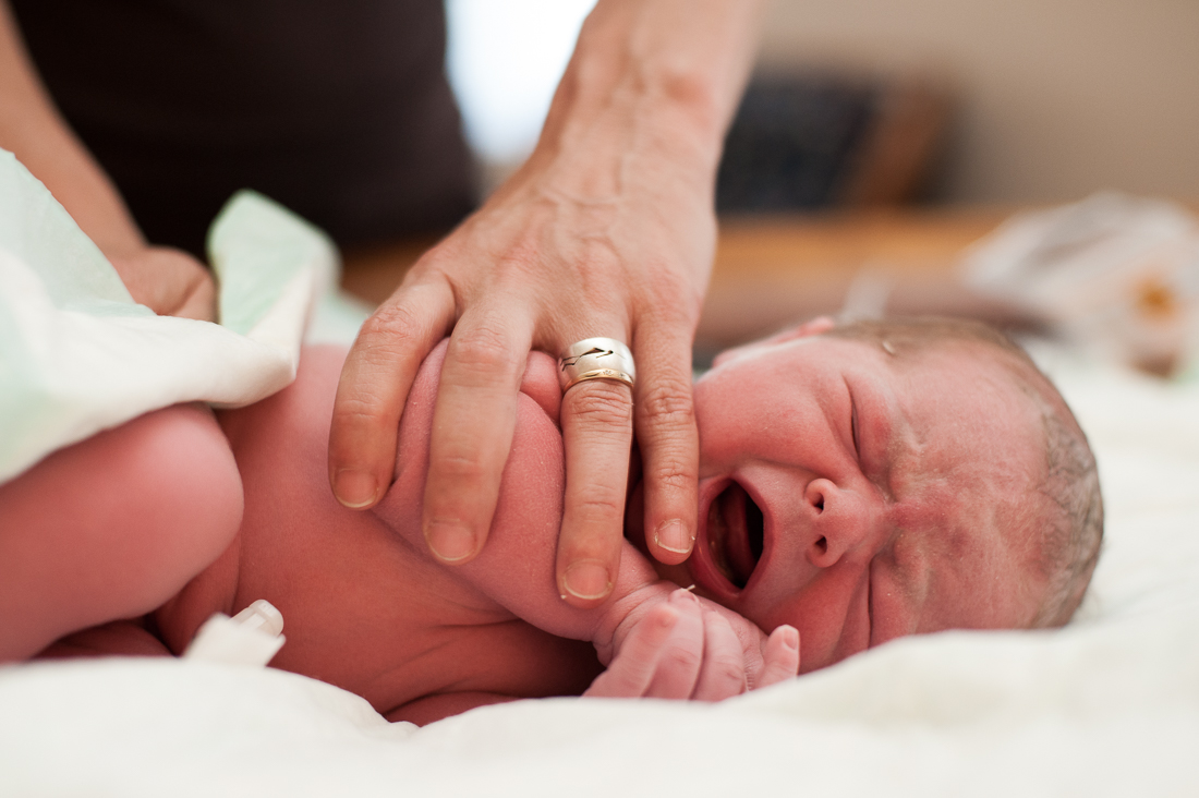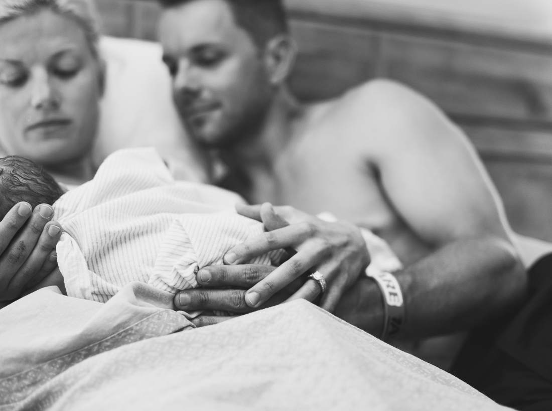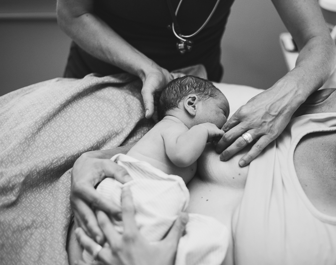 At two days overdue with their second baby, Mollie texted to inform me that contractions had started, but didn’t feel urgent. I made arrangements for my children, stayed in contact with her care provider, readied myself to run out the door and waited.  We birth photographers pray we make it to the birth center or hospital before the baby arrives and most times we do. But  babies have their own sweet, singular timing.  I got the text and I call I was waiting for, jumped in the car, hit the gas pedal, arrived at the birth center, and rushed up the stairs. I stopped short, hearing the unmistakeable mewling cry of a newly born tiny human. Mollie delivered Ridge Isaac 25 minutes before my arrival, and only 15 minutes after her own arrival at the Ashland Birth Center.  Her labor? Under 3 hours in length, and thus termed a “precipitous labor.”  After this mother of all workouts (pun intended!) she slugged a well-deserved smoothie, rested, laughed, and gazed at her son, Ridge. An aptly titled bracelet circled her wrist: “Champion.”